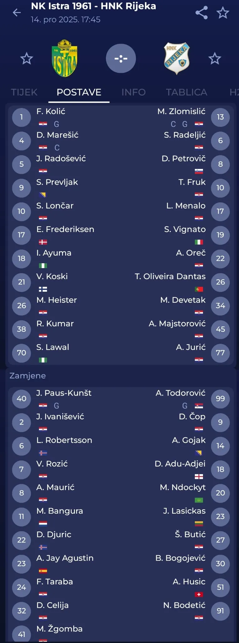 Istra 1961 (3-4-2-1): Kolić – Kumar, Marešić, Koski – Fredriksen, Radošević, Ayuma, Heister – Lončar, Lawal– Prevljak.