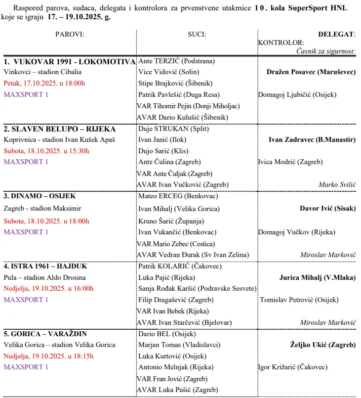 Stigli su suci i ostale službene osobe za 10. kolo hrvatskog nogometnog prvenstva. Povjerenik za suđenje Bernard Layec ih je odredio, a povjerenik natjecanja Antonio Gahovac objavio na službenoj stranici HNL-a.