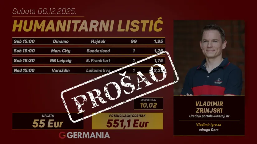 Svega 35 dana čekali smo na novi prolaz humanitarnog listića Germanijaka, a sretne ruke bio je Vladimir Zrinjski. Njegov listić prošao je s ukupnim tečajem 10,02! Germania Sport kladionica uložila je 55 eura, pa će dobitak od 523,77 eura po Vladimirovoj želji donirati humanitarnoj udruzi DORA iz Zagreba, koja skrbi o djeci i mladima. Njeni su štićenici djeca bez jednog ili oba roditelja, djeca iz obitelji s većim brojem djece, iz socijalno ugroženih obitelji, zlostavljana djeca, zanemarena, bolesna, potrebita, ali iznimno marljiva, nadarena i uporna. Vlado, svaka čast!
