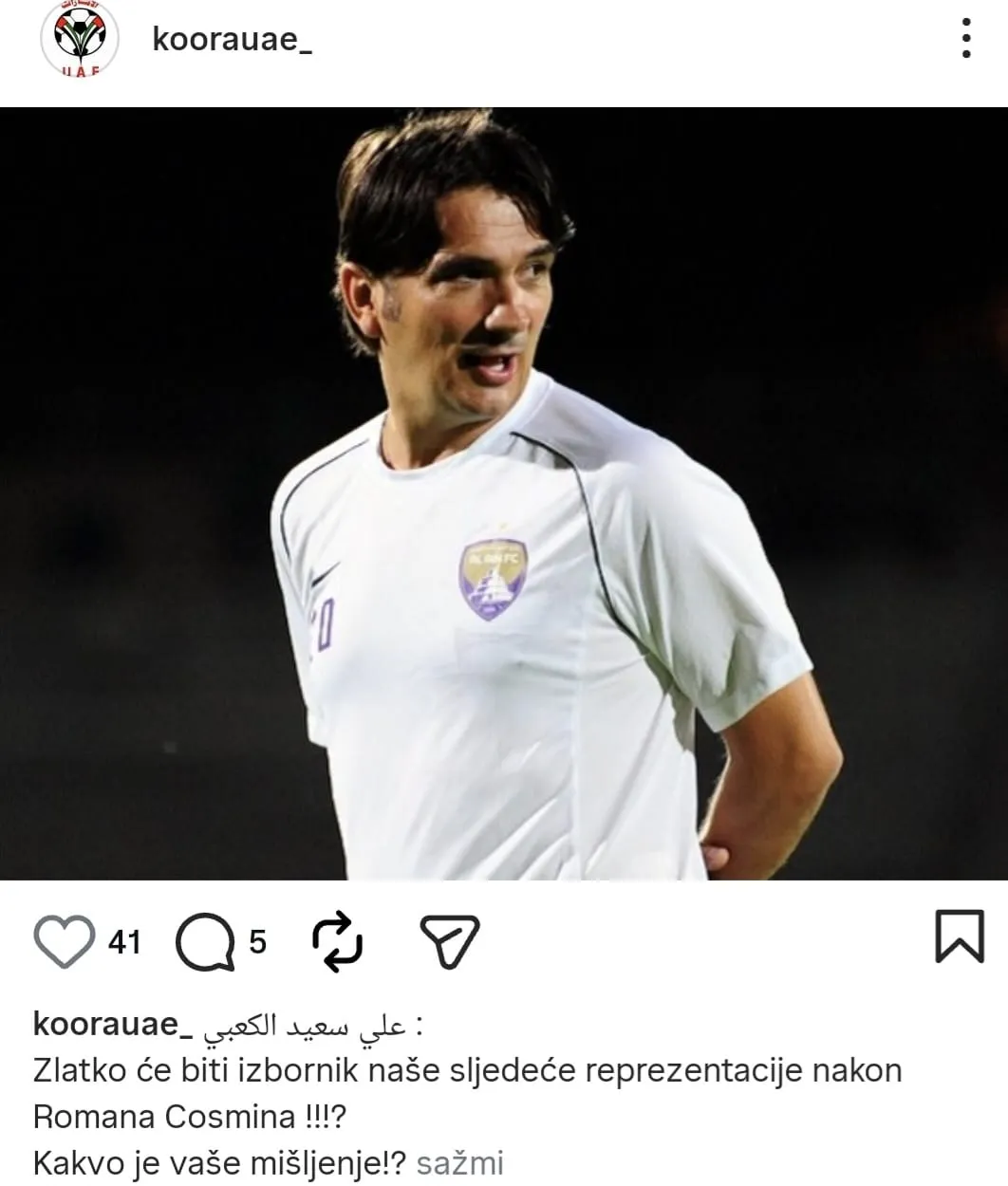 Više izvora, jako dobro upućenih u nogometna zbivanja na Bliskom Istoka, već neko vrijeme tvrdi da je Zlatko Dalić prvi i glavni izbor Emiraćana za novog izbornika, za nasljednika Rumunja Cosmina Olaroiua. On je klupu preuzeo prošlog ljeta, ali nije baš napravio velike stvari, u 13 utakmica upisao je četiri pobjede, pet remija i četiri poraza. Ali, čak i da jest uspješan, Dalić je već dugo tiha patnja mnogih reprezentacija u tom dijelu svijeta, spominjao se svojedobno i Katar, no, u Emiratima sad idu tako daleko da tvrde da ovaj put Dalić neće odbiti ponudu i da će nakon SP-a doći u Dubai. Da se tu više nema što promijeniti! Očito, priča se proširila pa su i neki tamošnji mediji počeli pisati o takvom raspletu, a jedna popularna nogometna Instragam stranica (na fotografiji) objavila je vijest o Dalićevu dolasku kao, praktički, gotovu stvar, uz priloženu anketu.