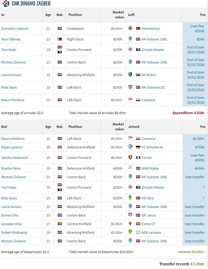 Svoje su ormariće podno južne tribine ispraznili Dejan Ljubičić, koji je otišao u Schalke, Sandro Kulenović (Torino), Gonzalo Villar (Elche), Robert Mudražija (AEK Larnaca), Moreno Živković (Vukovar) i Leon Jakirović (Inter). Uloga Dejana Ljubičića je kopnila kako se polusezona približavala svom kraju, a Kulenović je bio joker s klupe pa i, iako je njegov doprinos teško nadomjestiti, jasno je kako su Plavi programirali Belju kao Plavog devet i igrača koji će imati još veću ulogu u nastavku sezone. Soldo i Stojković su ostali, Lisica se oporavio i Dinamova je momčad duplirana na svim pozicijama i sa svim odlascima.