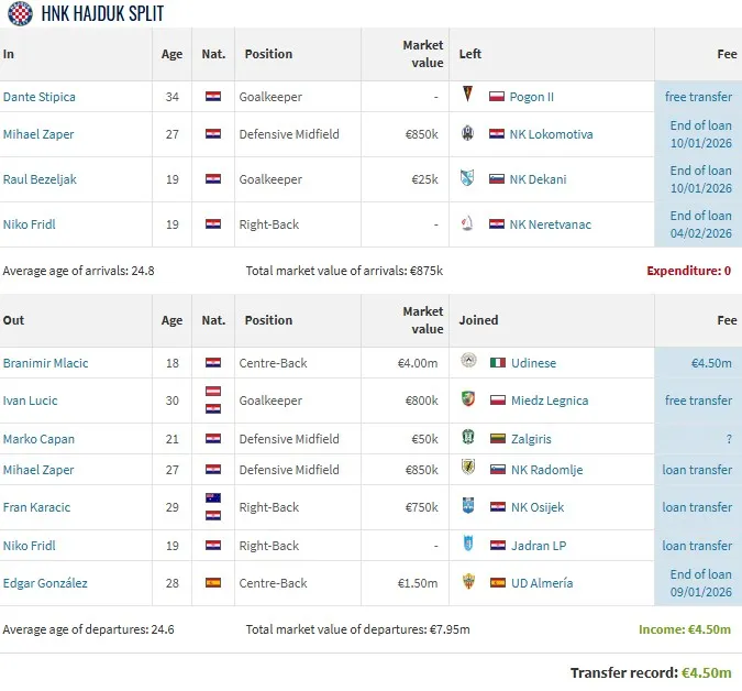 Poljudsku tržnicu obilježila je trakavica oko Branimira Mlačića i njegovog odbijanja Intera. Mladi stoper nije bio uvjeren u projekt Nerrazurra, a navodno je to dovelo i do određenih trzavica s klubom. Sama činjenica kako nije ostao u klubu do ljeta, unatoč inzistiranju tijekom cijelog prijelaznog roka, ipak nešto govori o tome... Mlačić je završio u Udineseu, a otišli i Karačić (Osijek), Gonzalez (Andorra), Lučić (Miedz) i Capan (Žalgiris).