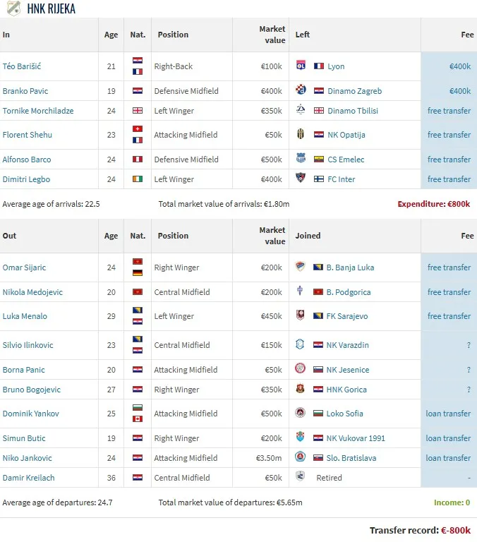 Prvo ime, kada su pojačanja u pitanju, je Teo Barišić. Nogometno školovan u Lyonu, stoper i desni bek odigrao je sjajnu utakmicu protiv Dinama u izostanku Ante Majstorovića i pokazao kako bi mogao osjetno napuniti riječku blagajnu, ako nastavi igrati u kontinuitetu tako. Stigli su još Branko Pavić (Dinamo), Tornike Morčiladze (Dinamo Tbilisi), Dimitri Legbo (Inter Turku) i Alfonso Barco (Emelec), čime je Rijeka osjetno podebljala broj nacionalnosti unutar svoje svlačionice.