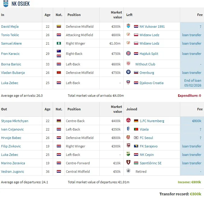 Hrvatski europski predstavnik zadržao je Latkovića, Mamuta i Mamića, ali od prodaje se živi. Tako je jedan od stupova obrane, Lamine Ba, otišao u poljski Slask iz Wroclawa. Naravno da sada slijedi novo uhodavanje linije ispred Olivera Zelenike, ali Nikola Šafarić je već pokazao kako nema s tim problema i kako je sposoban iznova stvarati nove igrače. Poziciju Mauritanca već čekaju Luka Škaričić i Novak Tepšić. Osim njega, klub je napustio Marko Dabro (Slaven Belupo), a nema ni Vane Jovanova (Nyiregyhaza). Posljednjeg je dana, barem privremeno, Barokni Grad iza sebe ostavio i Mate Antunović (Dugopolje - posudba).