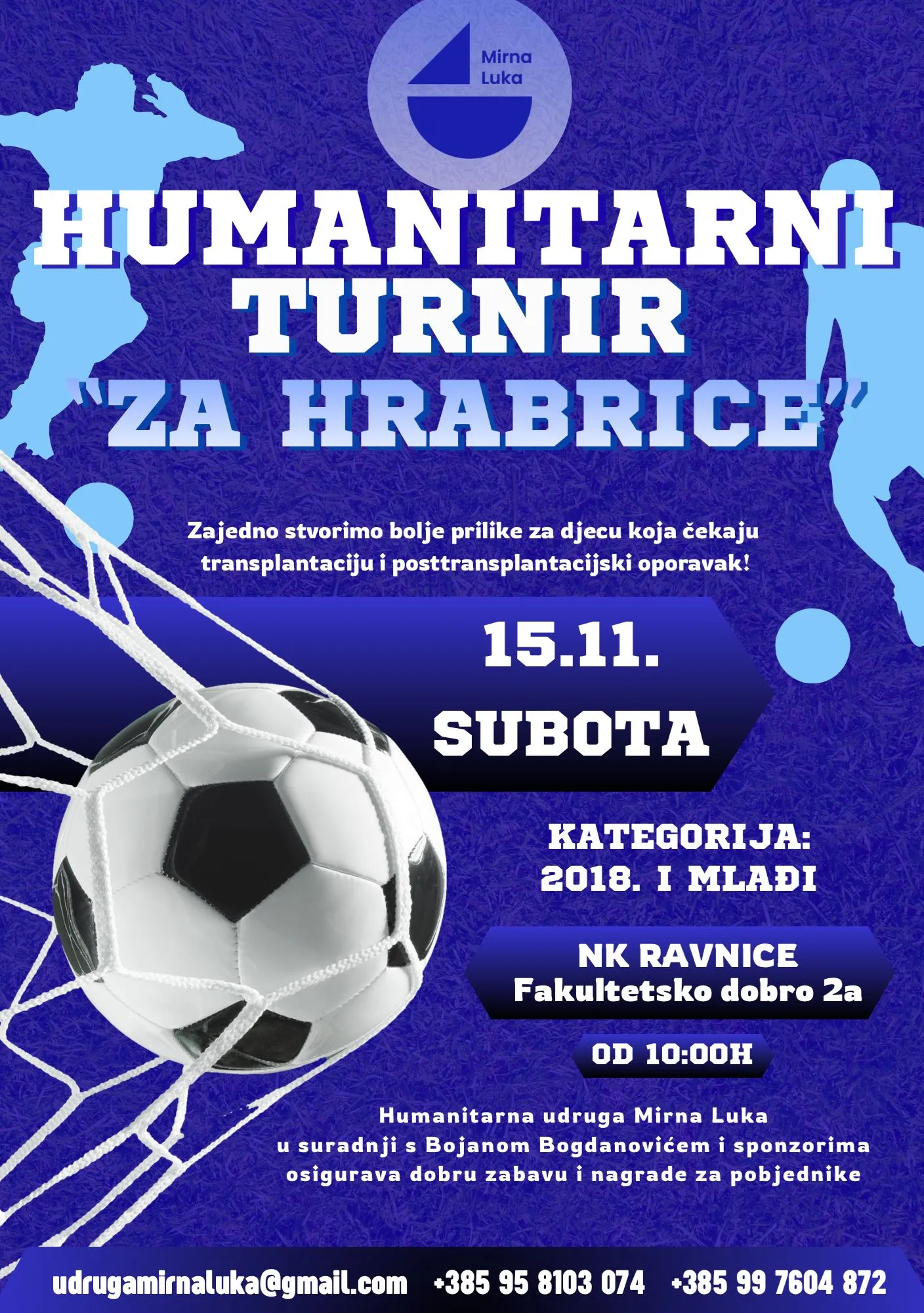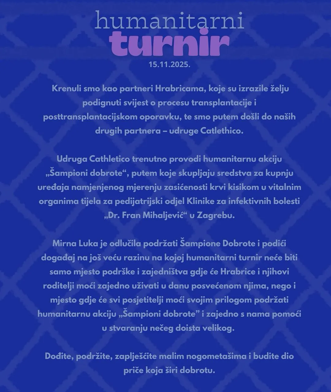 U subotu, 15. studenoga 2025., u Zagrebu će se održati humanitarni nogometni turnir za djecu rođenu 2018. godine, u organizaciji humanitarne udruge Mirna Luka. Događaj će se održati u sklopu NK Ravnice, jednog od brojnih partnera turnira, a uz nogomet očekuju se i brojne druge aktivnosti – ping pong, kreativne radionice, animacije, nagradne igre i još mnogo toga. Velika podrška udruzi Mirna Luka i ovom događaju je i bivši hrvatski košarkaš Bojan Bogdanović, koji je prepoznao važnost inicijative i uključio se kao partner.