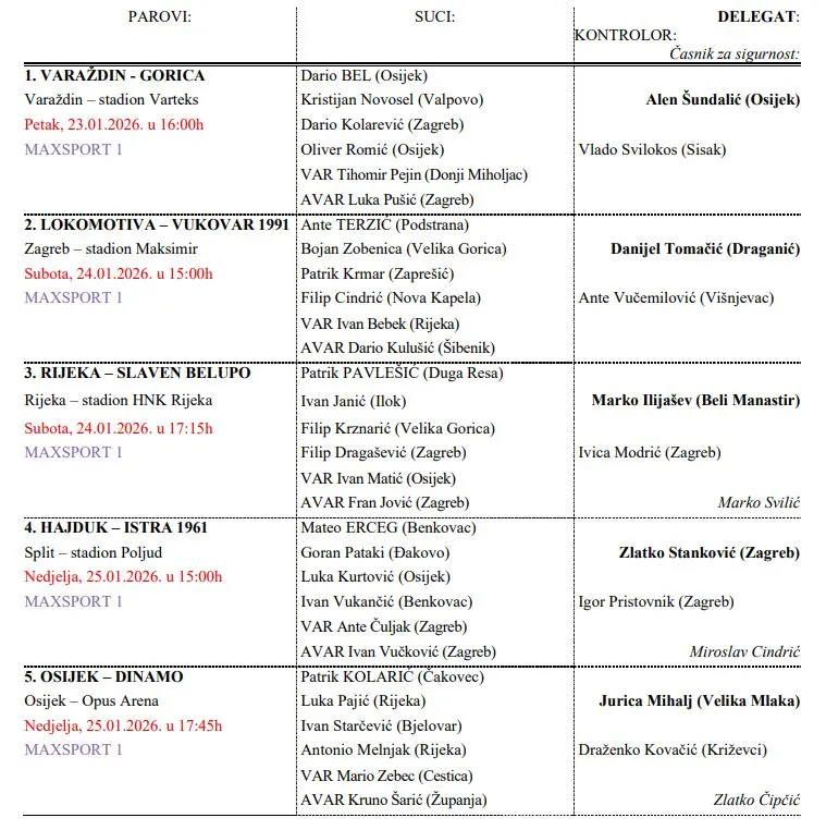 U prvoj utakmici 19. kola HNL-a između Varaždina i Gorice (petak, 16 sati, Max Sport 1) pravdu će dijeliti Dario Bel iz Osijeka, dok će u VAR sobi biti Tihomir Pejin iz Donjeg Miholjca.