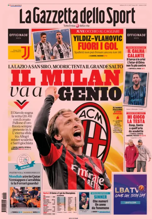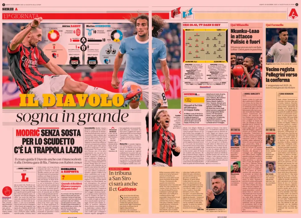 Allegri se osjeća mirnije s “megafonom” poput Modrića, koji obvezuje sve na isti pobjednički ritam. Gazzetta iz pera Andree Ramazzottija posebno ističe i povratak samopouzdanja Rafaela Leãa na San Siru. Nakon što u prošloj sezoni u Seriji A na domaćem terenu nije zabio nijedan pogodak, u posljednje tri domaće utakmice postigao je tri gola i upisao jednu asistenciju. Pobjeda bi u subotu navečer omogućila Allegriju da barem jednu noć provede na čelu ljestvice.