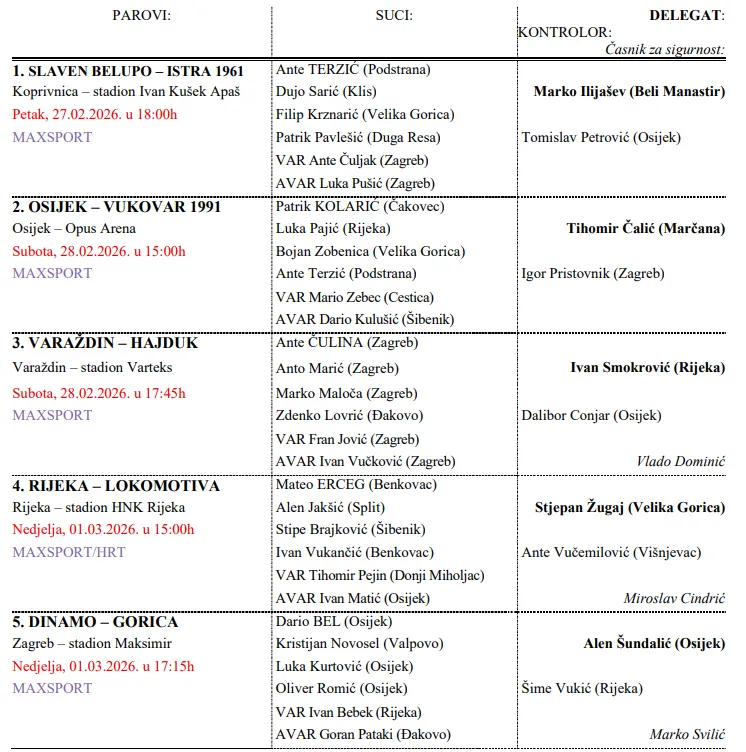 Raspored nam ponovno donosi pet utakmica od petka do nedjelje. Kolo će otvoriti Slaven Belupo i Istra 1961, s početkom u 18 sati u Koprivnici. Glavni sudac bit će Ante Terzić iz Podstrane, dok će u VAR sobi biti njegov imenjak Ante Čuljak iz Zagreba.