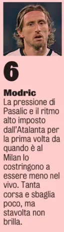 Talijanski komentatori ovog puta nisu štedjeli prvi put kritiziranog Modrića. La Gazzetta dello Sport mu je dala ocjenu 6 uz opasku: “Pašalićev pritisak i visoki ritam koji Atalanta nameće, prvi put otkako je u Milanu, tjerali su ga da bude manje utjecajan u igri. Puno je trčao i malo griješo, ali ovoga puta nije zablistao.” Eurosport mu je dodijelio ocjenu 6: „Pokreće igru, presijeca napade, ali u drugom dijelu pokazuje znakove umora”. Skysport je Luki dao 6,5: „Modrić je i dalje ključan faktor ravnoteže, čak i kad nije na najvišoj razini”. Sportmediaset ističe: „I kralj lopte osjetio je pritisak. Posebno je bio zaustavljen od sunarodnjaka Marija Pašalića“ – i spušta ocjenu na 5,5. Najkritičniji je Corriere dello Sport: „Ključni trenutak bila je Modrićeva greška u fazi izgradnje igre, iz koje je nastao gol Atalante; to je bio presudan trenutak susreta”, pišu u opširnoj analizi.