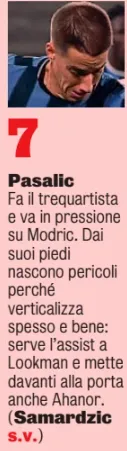 „Mario Pašalić je brzim dodavanjem proigrao Lookmana na desetak metara od gola, a Nigerijac je silovito opalio i pogodio uz vratnicu, ostavivši golmana bez šanse“, piše Gazzetta dello Sport. Talijanski novinari ističu da je Pašalić cijelu utakmicu bio pokretač vezne linije domaćina, dok je s druge strane Luka Modrić, iako standardno pouzdan, doživio rijetke trenutke slabosti.