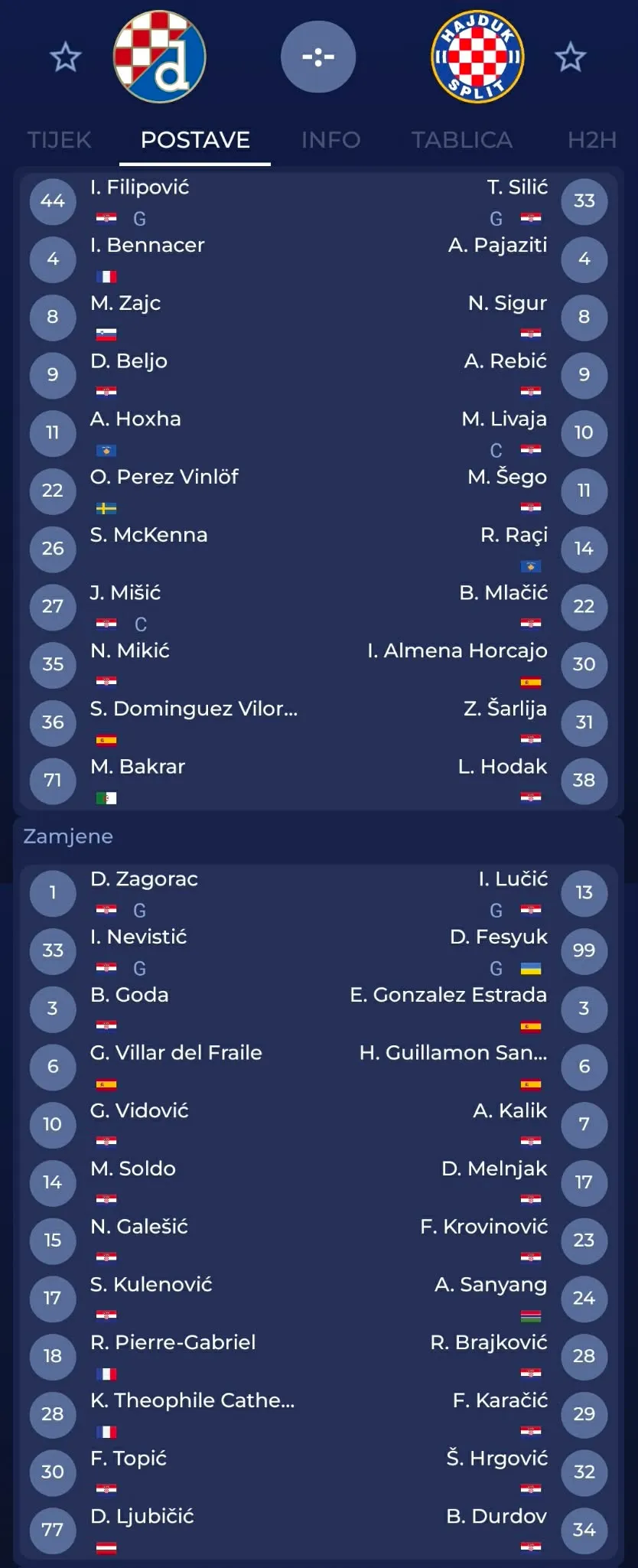 Dinamo (4-3-3): Filipović - Mikić, Dominguez, McKenna, Perez-Vinlöf - Bennacer, Mišić, Zajc - Bakrar, Beljo, Hoxha. Trener: Mario Kovačević.