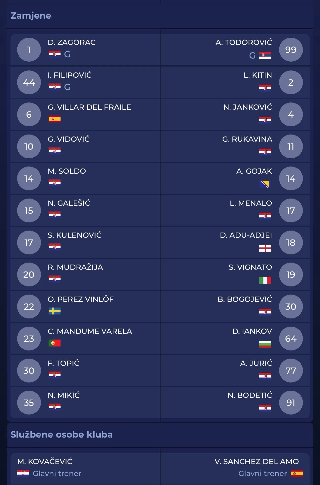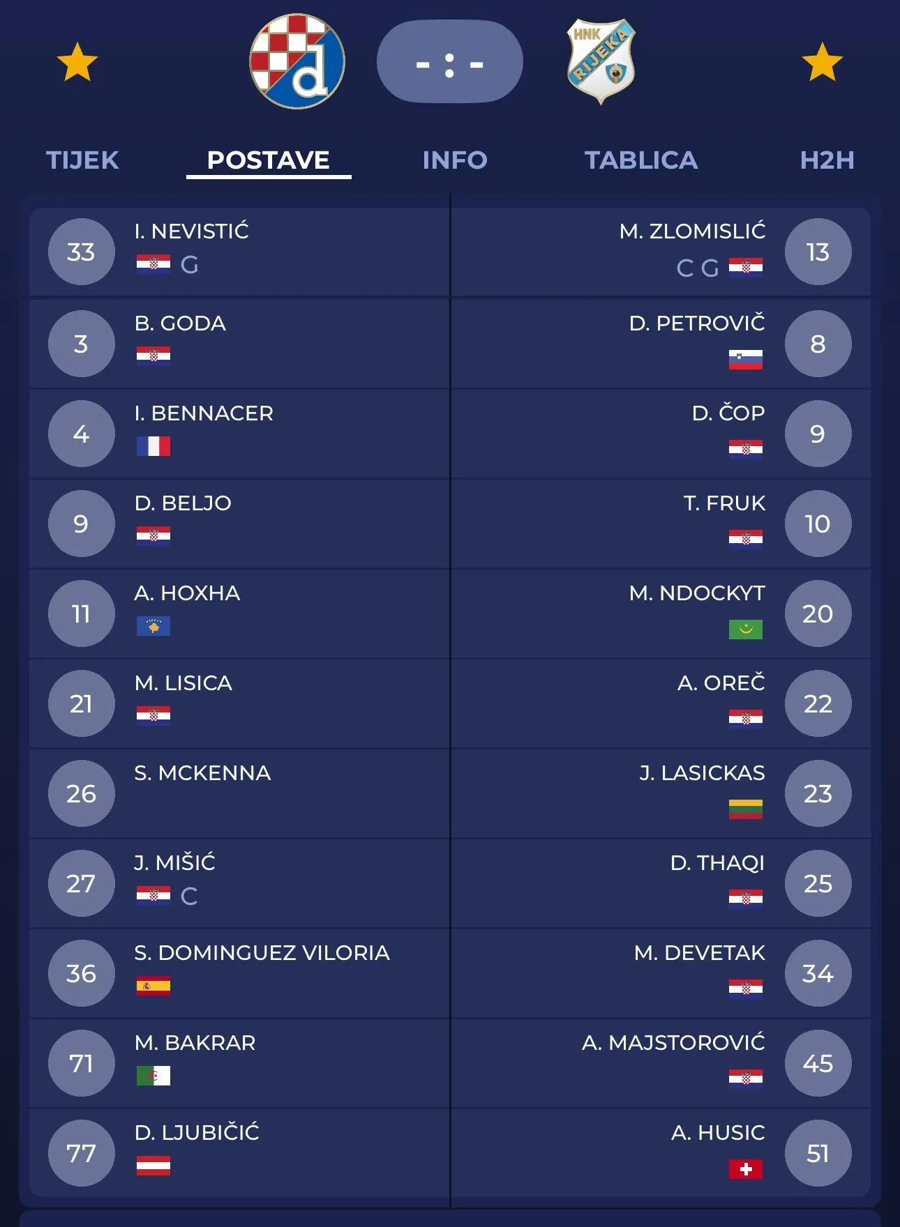 Dinamo (4-3-3): Nevistić – Lisica, Dominguez, McKenna, Goda – Ljubičić, Bennacer, Mišić – Bakrar, Beljo, Hoxha.