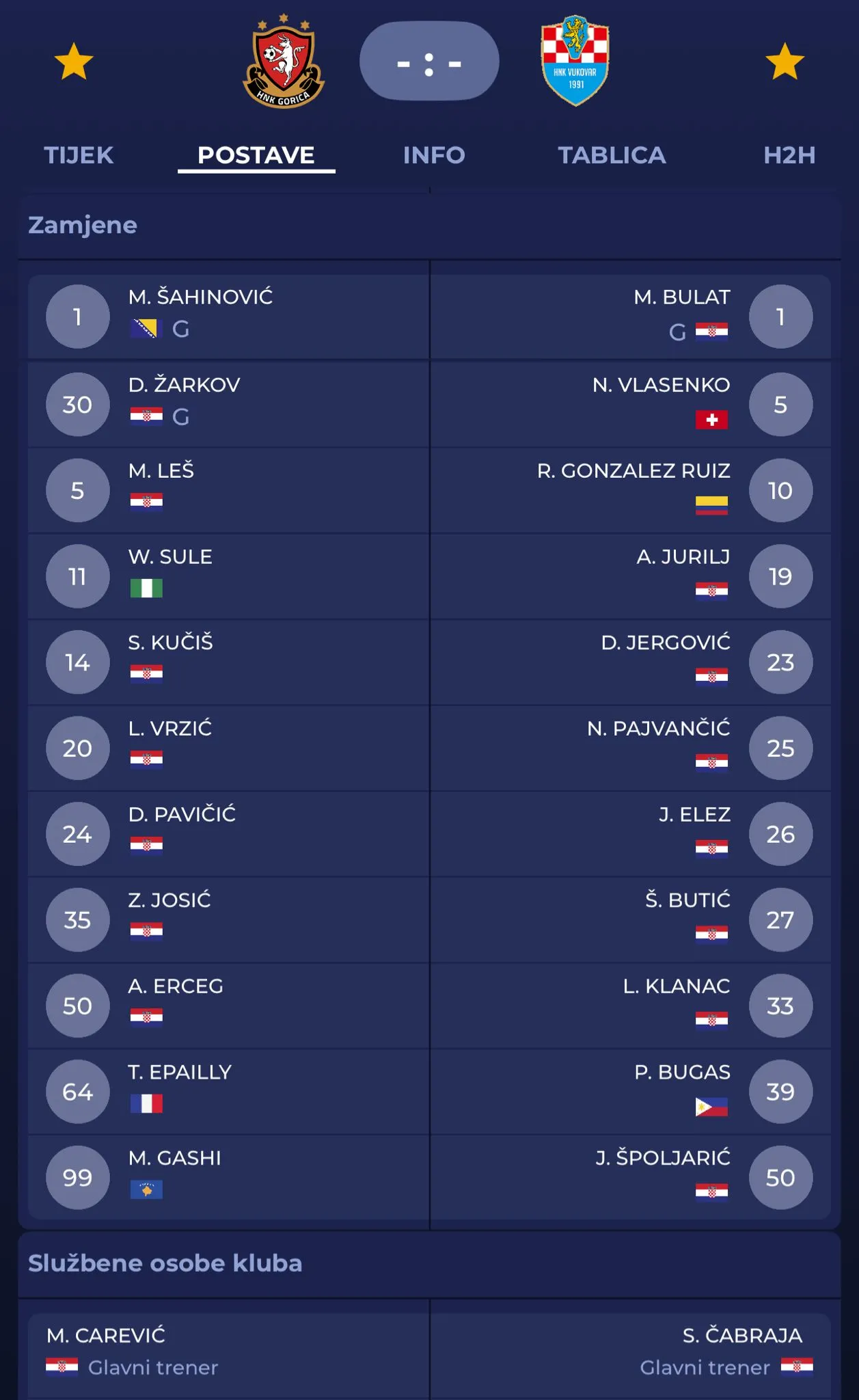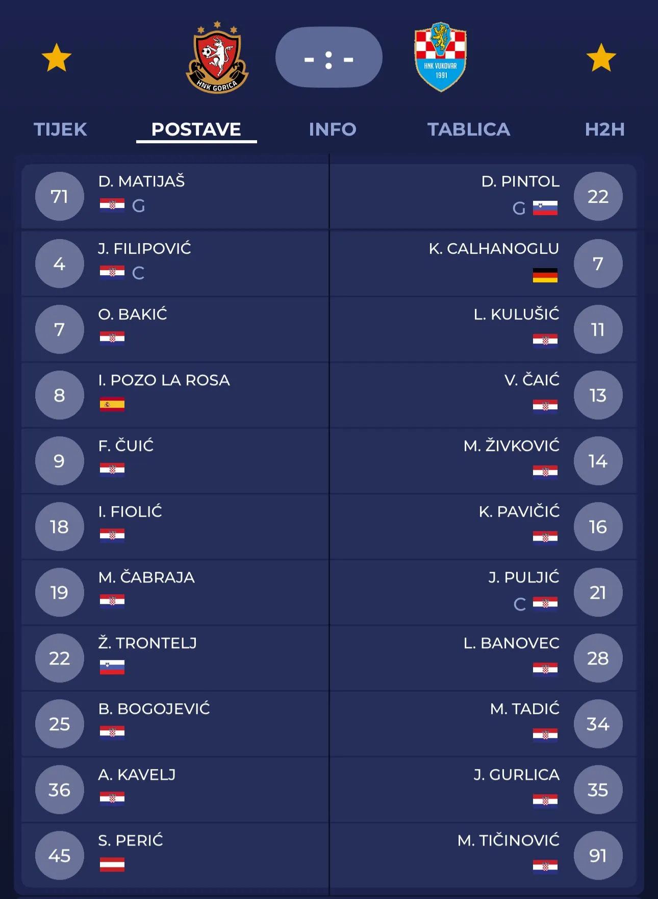 Gorica (4-2-3-1): Matijaš – Trontelj, Perić, Filipović, Čabraja – Kavelj, Pozo – Fiolić, Bakić, Bogojević – Čuić.