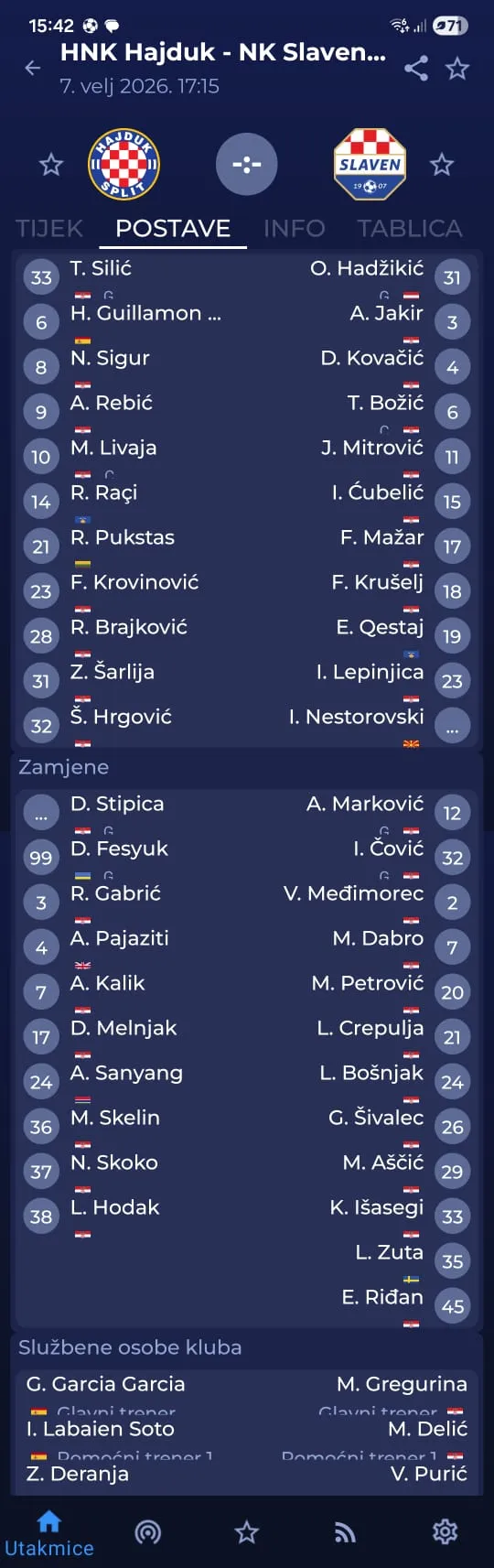 Hajduk (4-2-3-1): Silić - Sigur, Šarlija, Raçi, Hrgović - Guillamon, Krovinović - Brajković, Pukštas, Rebić - Livaja. Trener: Gonzalo Garcia.