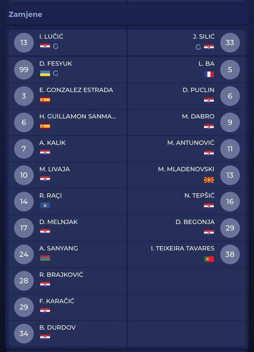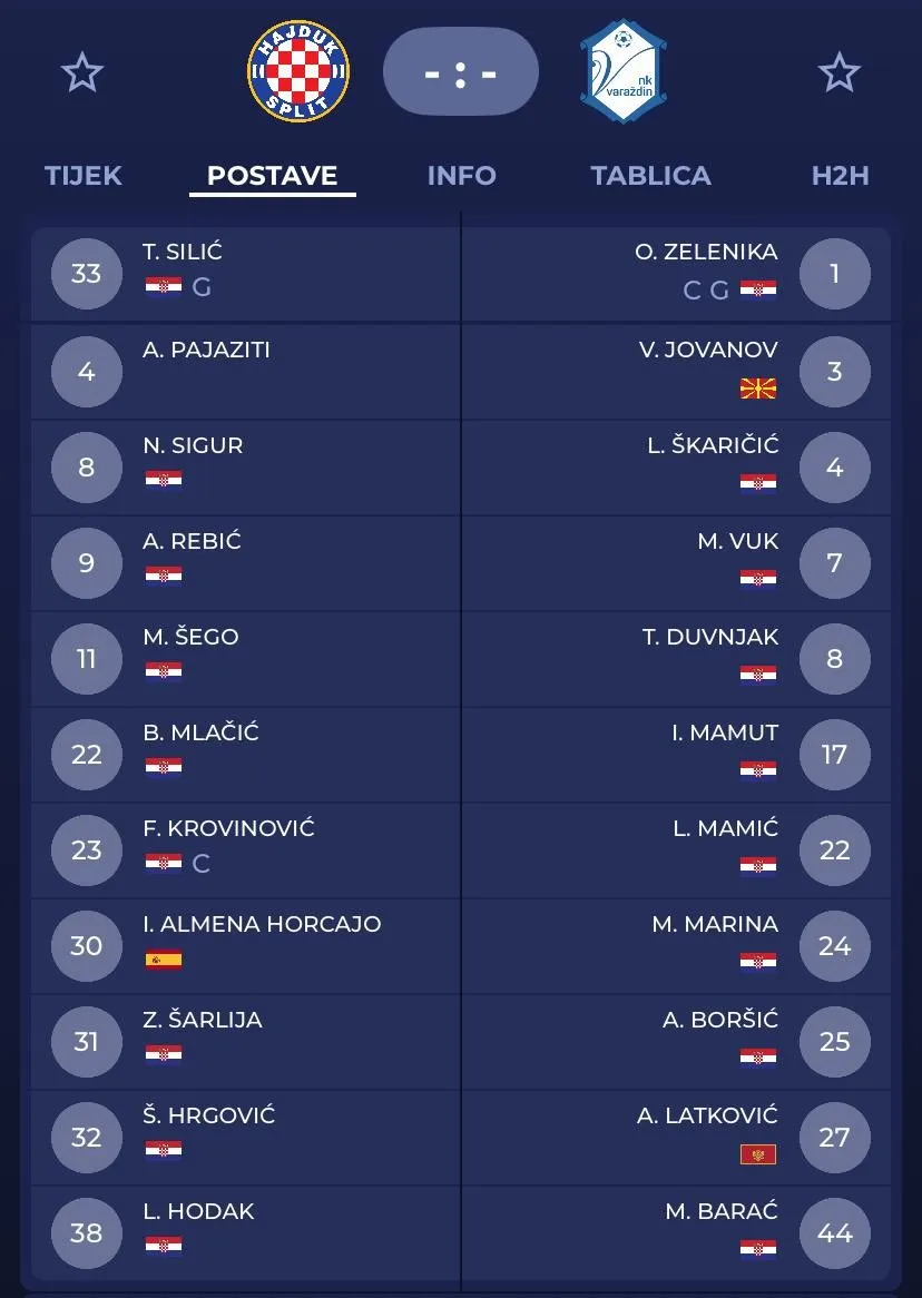 Hajduk (4-2-3-1): Silić - Hodak, Šarlija, Mlačić, Hrgović - Sigur, Pajaziti - Almena, Krovinović, Rebić - Šego. Trener: Gonzalo Garcia.