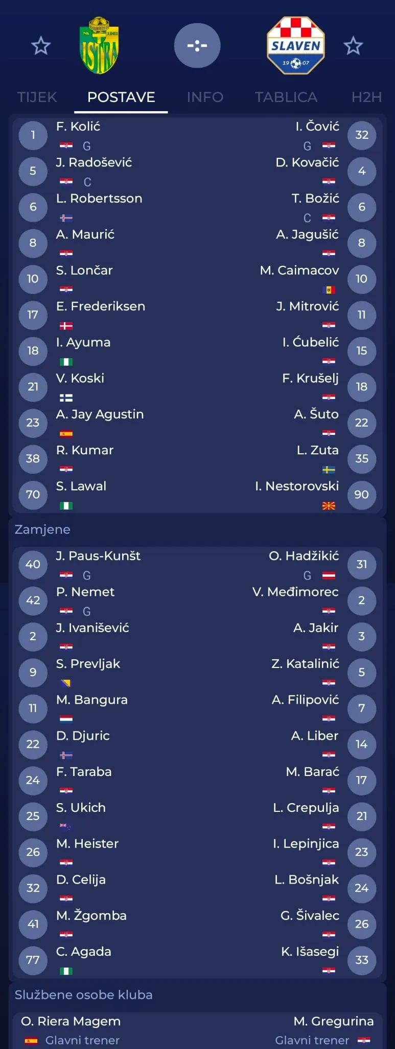Istra 1961 (3-4-2-1): Kolić – Kumar, Robertsson, Koski – Jay, Maurić, Radošević, Frederiksen – Ayuma, Lončar – Lawal. Trener: Oriol Riera.