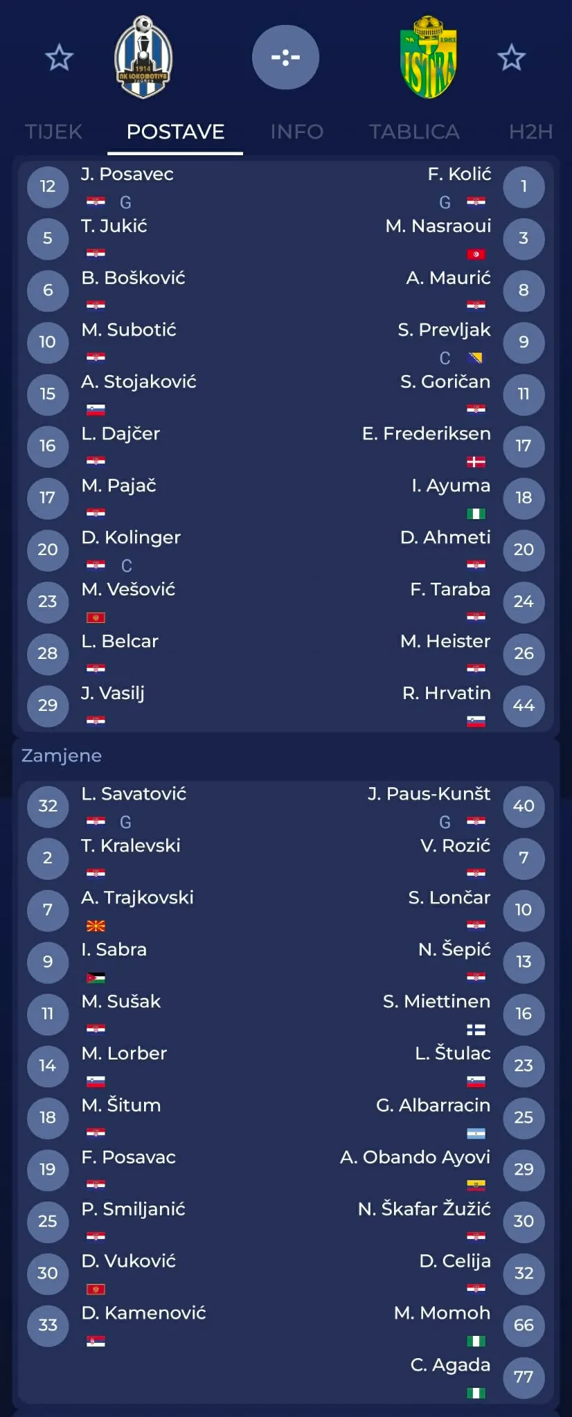 Istra 1961 (4-2-3-1): Kolić – Hrvatin, Taraba, Nasraoui, Heister – Ahmeti, Ayuma, – Frederiksen, Maurić, Goričan – Prevljak.
