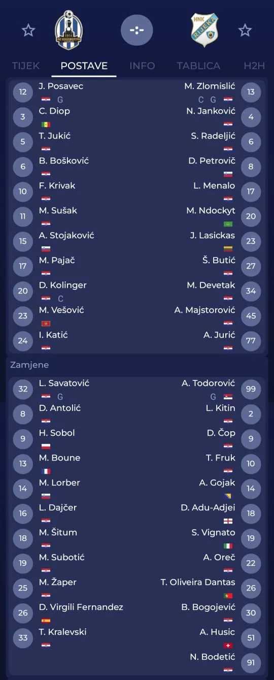 Rijeka (3-4-2-1): Zlomislić – Majstorović, Radeljić, Devetak – Lasickas, Petrovič, Ndockyt, Menalo – Butić, Janković – Jurić. Trener: Victor Sanchez.