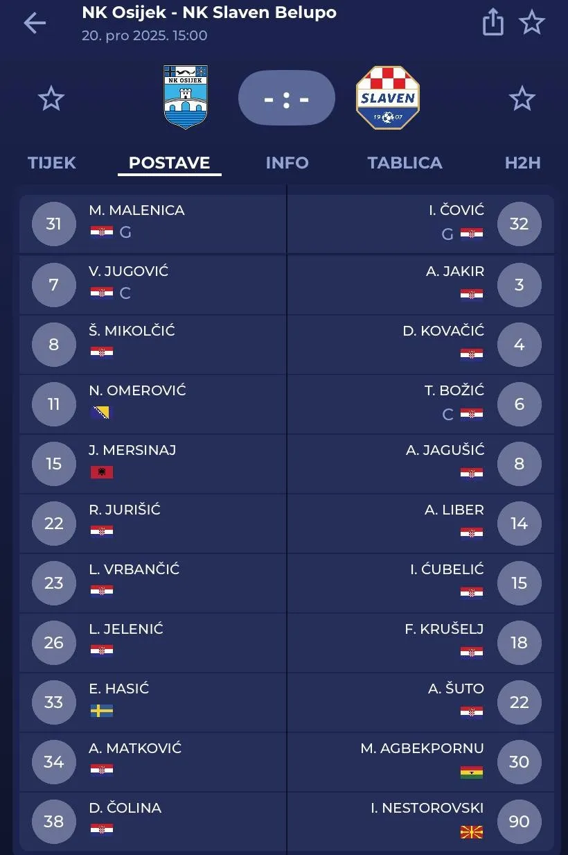 Osijek (3-4-1-2): Malenica - Hasić, Jelenić, Mersinaj – Čolina, Vrbančić, Jugović, Jurišić – Mikolčić - Matković, Omerović