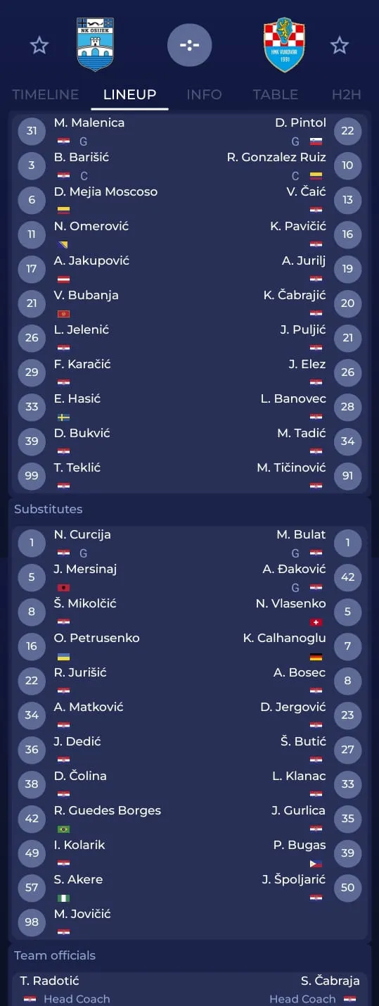 Osijek (4-2-3-1): Malenica – Karačić, Hasić, Jelenić, Barišić – Bubanja, Meija – Bukvić, Teklić, Omerović – Jakupović