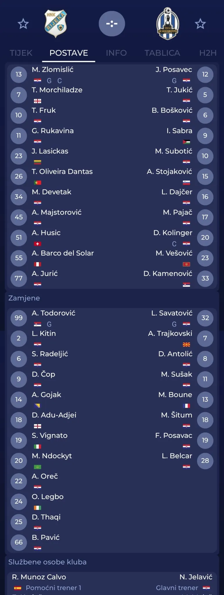 Rijeka (3-4-2-1): Zlomislić – Majstorović, Husić, Devetak – Oreč, Dantas, Barco, Morčiladze– Rukavina, Fruk – Jurić.