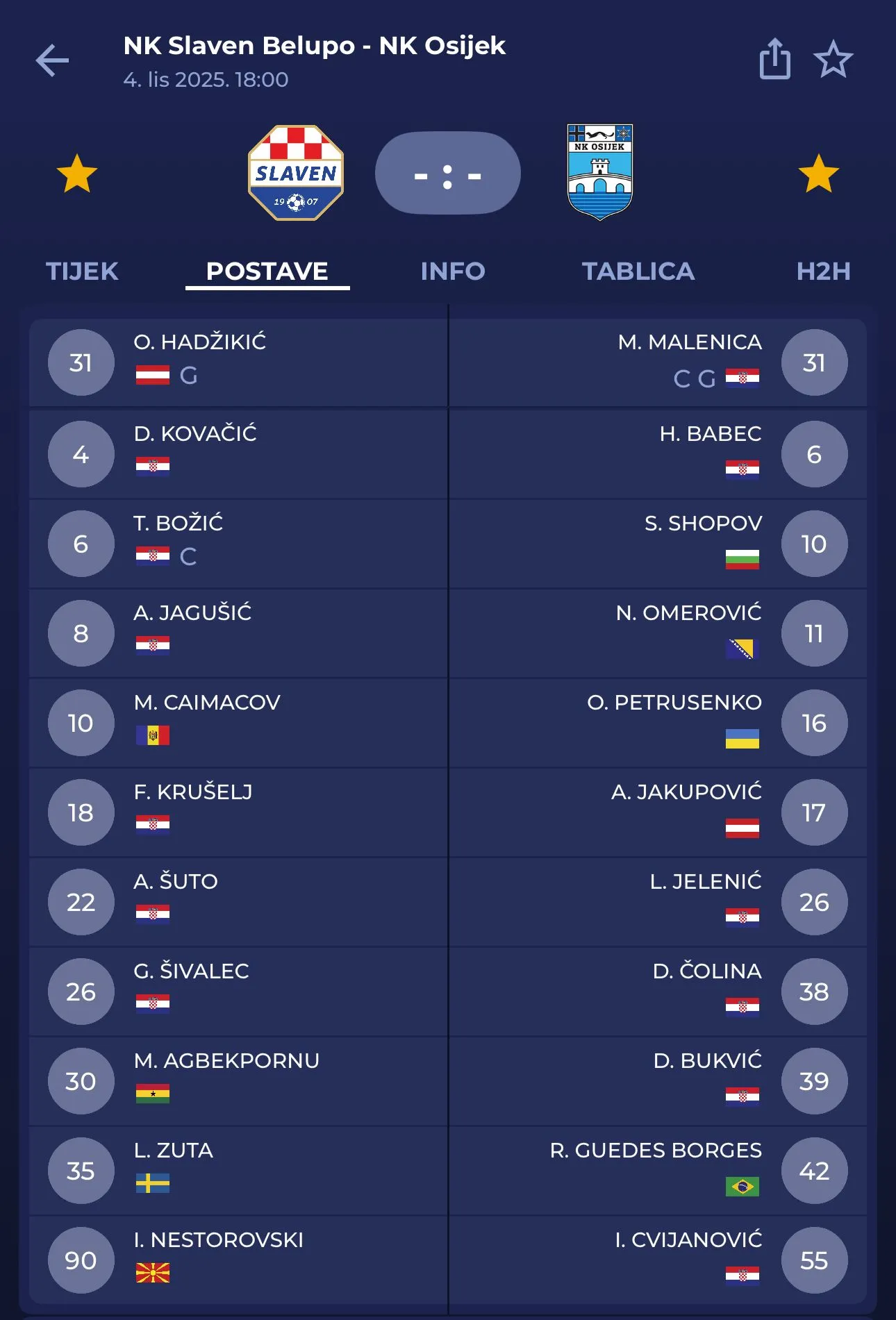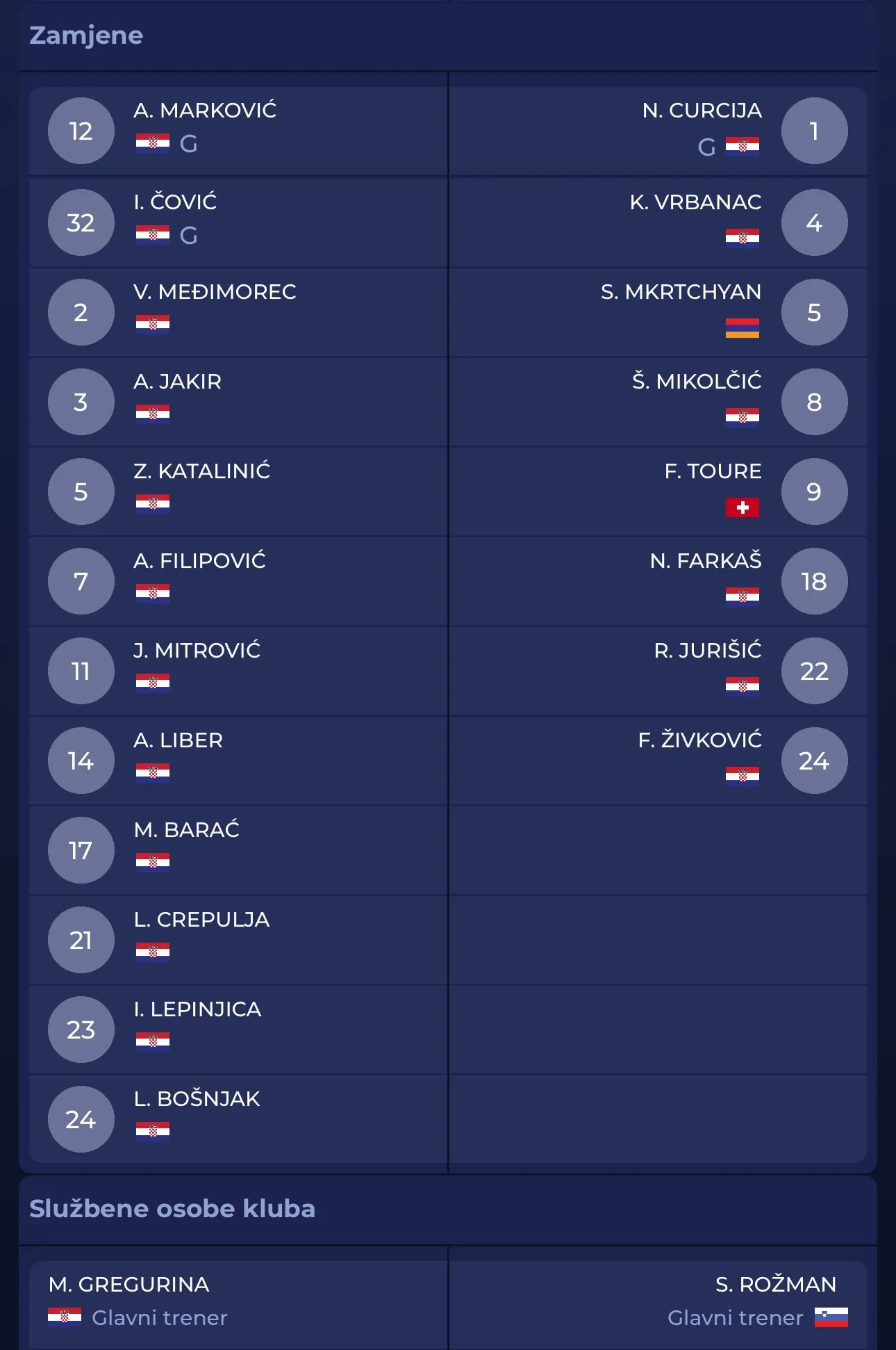 Osijek (4-2-3-1): Malenica – Guedes, Jelenić, Cvijanović, Bukvić – Babec, Petrusenko – Čolina, Šopov, Omerović – Jakupović.