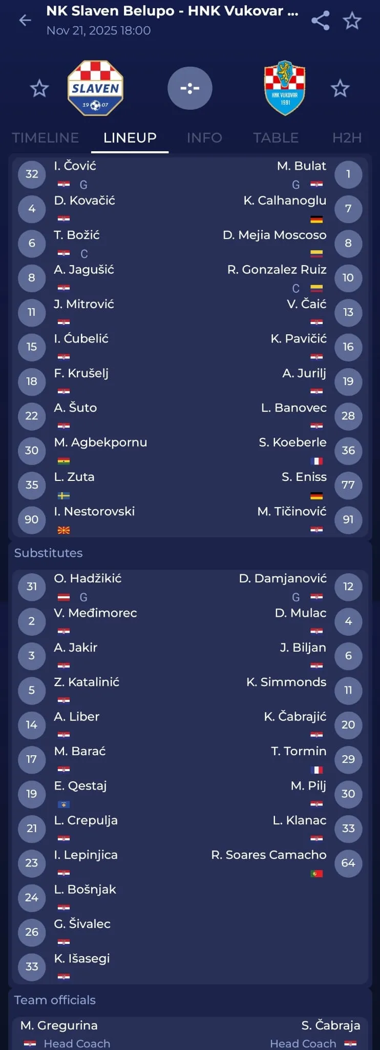 Slaven Belupo (4-2-3-1): Čović – Krušelj, Božić, Kovačić, Žuta – Agbekpornu, Ćubelić – Šuto, Jagušić, Mitrović – Nestorovski. Trener: Mario Gregurina.