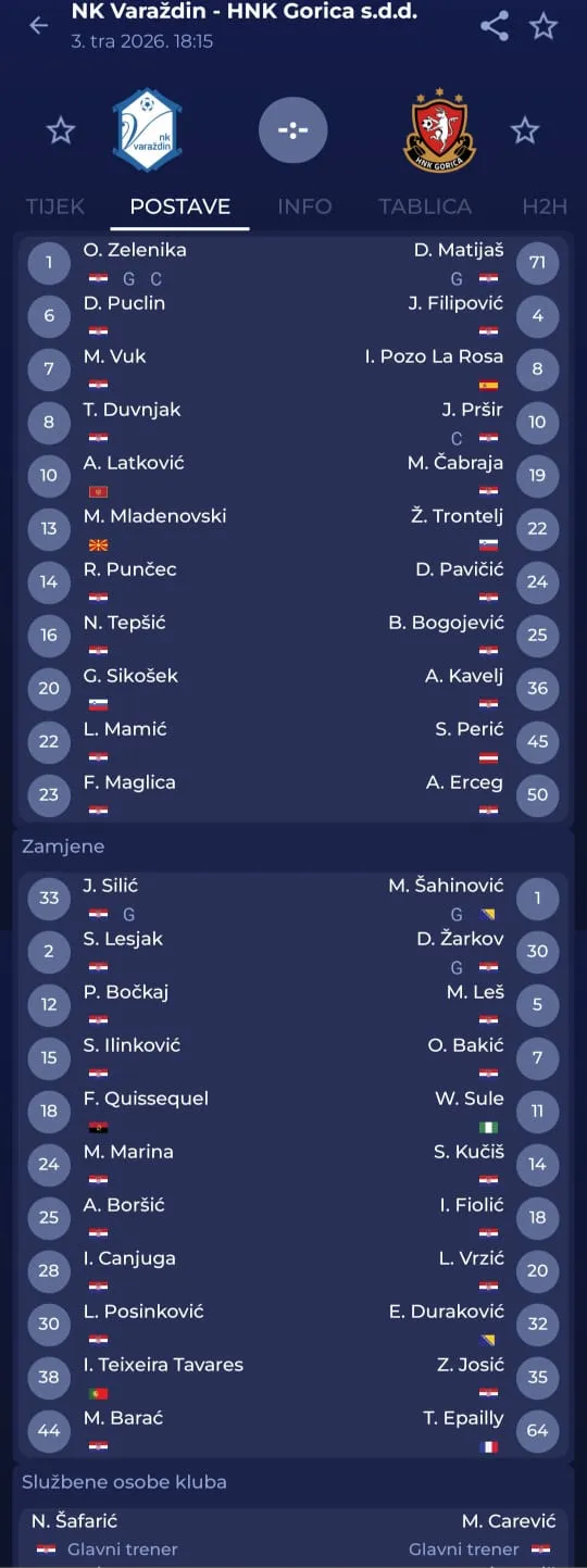 Gorica (3-4-2-1): Matijaš – Filipović, Perić, Čabraja – Trontelj, Pozo, Kavelj, Bogojević – Pršir, Pavičić – Erceg. Trener: Mario Carević.