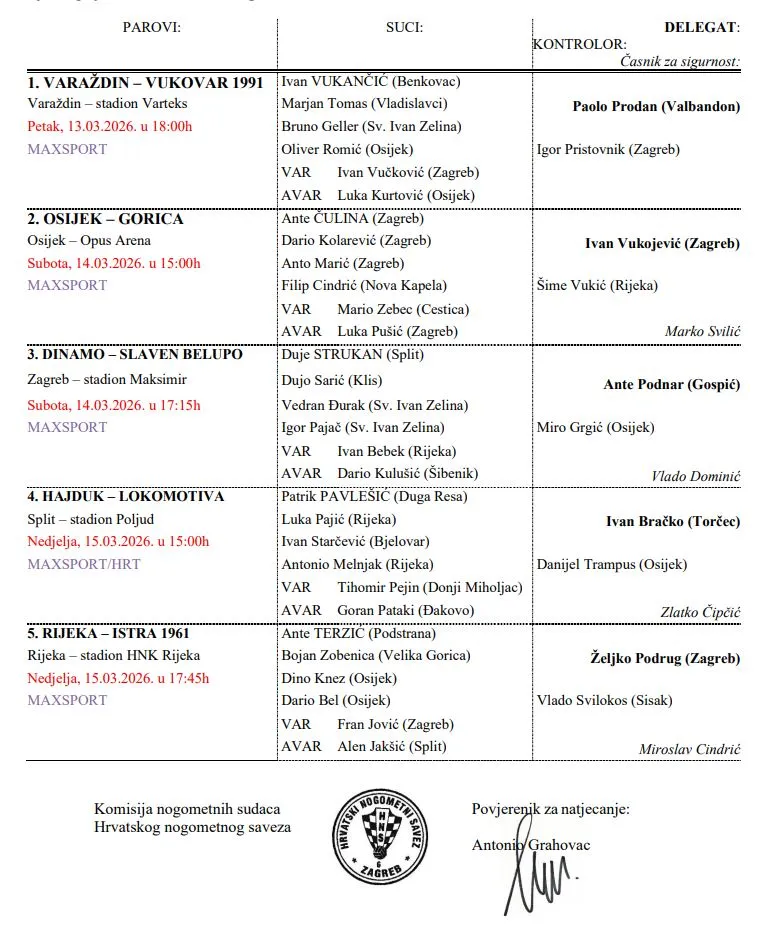 U nedjelju će prvi na teren Hajduk i Lokomotiva (15.00, MAX Sport 1, HTV2). Dužnost da sudi taj dvoboj pripala je Patriku Pavlešiću, a Tihomir Pejin bit će glavni u VAR sobi.