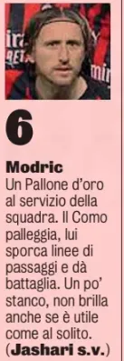 La Gazzetta dello Sport nije štedjela kapetana hrvatske nogometne reprezentacije. Hrvatski veznjak, dobitnik Zlatne lopte 2018., dobio je ocjenu 6 od glavnog talijanskog sportskog dnevnog lista uz opasku: “Pallone d'oro bio je u službi momčadi. Como je težio pas-igri, Luka to kvario i borio se. Malo je umoran, nije blistao, iako je bio koristan kao i obično,” napisao je izvjestitelj Gazzette, jasno sugerirajući da je hrvatski veznjak odigrao malo ispod svojih dosadašnjih partija.
