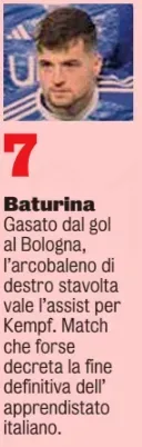 Što se pak Martina Baturine tiče, Gazzetta dello Sport dodijelila mu je ocjenu 7, što ga smješta među najbolje igrače domaće momčadi unatoč porazu: “Ohrabren golom protiv Bologne, ovaj put je svojom desnicom asistirao pogodivši Kempfovu glavu za 1-0. Utakmica koja je možda označila kraj njegovog talijanskog naukovanja,” napisala je Gazzetta.