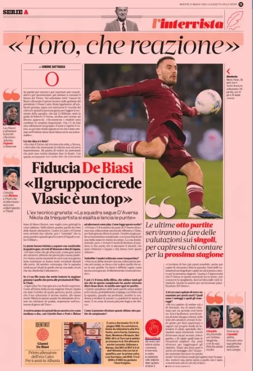 Zbog toga ga je i bivši trener Marco Baroni opisao kao “nezamjenjivog”, objašnjavajući da cijela momčad mora promijeniti način igre kada ga nema. U takvoj slici Torina, De Biasijev intervju dolazi kao svojevrsni pečat: Nikola Vlašić u Torinu više nije samo uspješan stranac, nego stožerni igrač oko kojeg se gradi i sadašnjost i ambicioznija budućnost Granate. Uostalom, nije slučajno u ljeto 2025. postao kapetan i to ostao pod sadašnjim trenerom Robertom D'Aversom! (G)