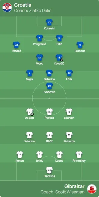 Hrvatska (4-2-3-1): Kotarski - Marco Pašalić, Erlić, Pongračić, Bradarić - Moro, Kovačić - Majer, Baturina, Fruk – Ivanović. Izbornik: Zlatko Dalić.