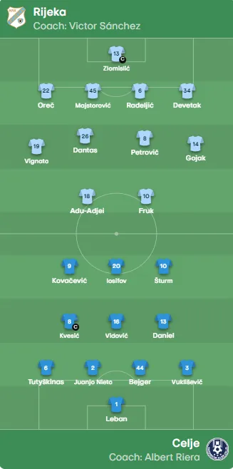 Rijeka (4-4-2): Zlomislić – Oreč, Majstorović, Radeljić, Devetak – Vignato, Dantas, Petrovič, Gojak – Fruk, Adu-Adjei. Trener: Victor Sanchez.