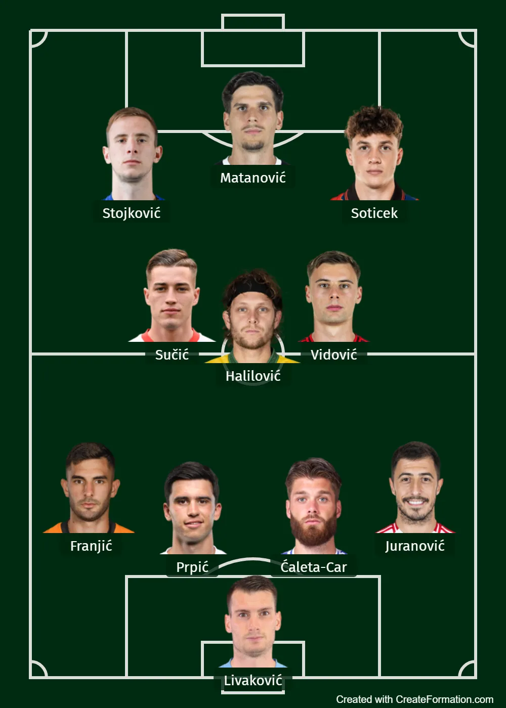 Livaković - Juranović, Ćaleta-Car, Prpić, Melnjak (Franjić) – Sučić, Halilović, Vidović (Janković) Šotiček, Matanović (Ljubičić), Stojković.