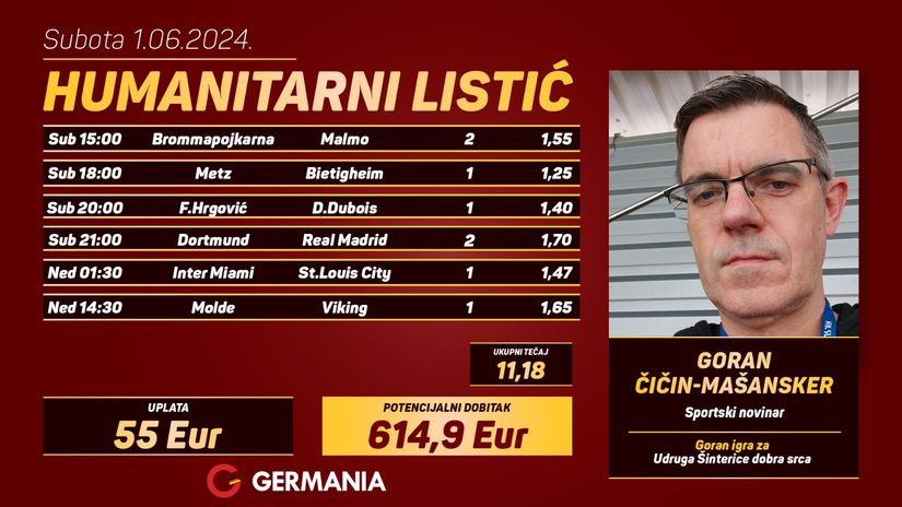 Ovaj vikend Germanijin humanitarni listić ispunjava Goran Čičin-Mašansker, koji već više od četvrt stoljeća prati nogometaše Slavena Belupa i rukometašice Podravke Vegete, kao i međunarodni nogomet te ostala rukometna zbivanja za Sportske novosti i ostale nacionalne i lokalne medije.