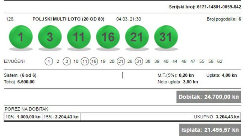 Sretni igrač je odigrao listić u poljskom Multi lotu 20 od 80 i odabrao šest brojeva: 1, 3, 11, 16, 21 i 31. Ukupni tečaj je bio 6.500,00.