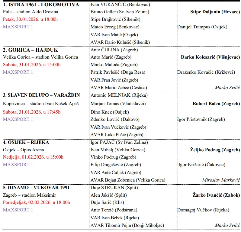 Subotnji program započinje susretom između Gorice i Hajduka (15.00), a pravdu će na toj utakmici dijeliti Ante Čulina iz Zagreba. Njegov sugrađanin Fran Jović sjedit će u VAR-u. Od 17.45 se u Koprivnici sastaju se Slaven Belupo i Varaždin. Glavni sudac bit će Riječanin Antonio Melnjak, dok će uz VAR tehnologiju sve nadgledati njegov Ivan Vučković iz Zagreba.