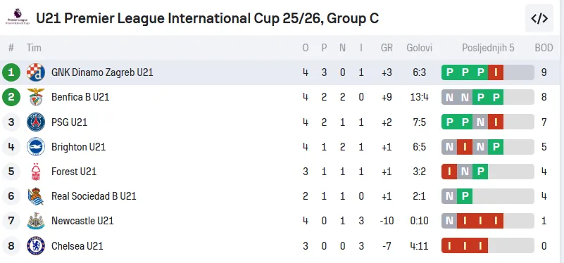 Brighton je bio jači, konkretniji i slavio 2-0 protiv Dinamovih juniora u četvrtom kolu Premier League International Cupa, turnira na kojemu igraju druge momčadi engleskih klubova uz pozvane klubove iz Europe. Dinamo je tamo već godinama jedan od važnih sudionika, a ove će godine nastaviti svoj put i nakon natjecanja po skupinama. Unatoč porazu, momčad Jerka Leke izborila je plasman u četvrtfinale, zahvaljujući trima pobjedama u prva tri kola te rezultatima koji su joj išli na ruku. Modre teoretski može prestići još Real Sociedad, koji ima četiri boda i još dvije utakmice do kraja, ali četvrtfinale Dinamu više nitko ne može uzeti.