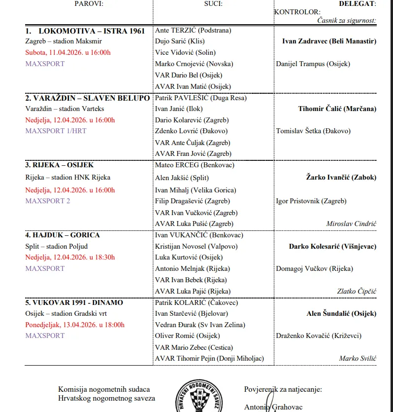 U nedjelju od 16 sati igraju Varaždin i Slaven Belupo (MAX Sport 1 i HTV2), glavni sudac bit će Patrik Pavlešić (Duga Resa), a u VAR sobi su Zagrepčani Ante Čuljak i Fran Jović.