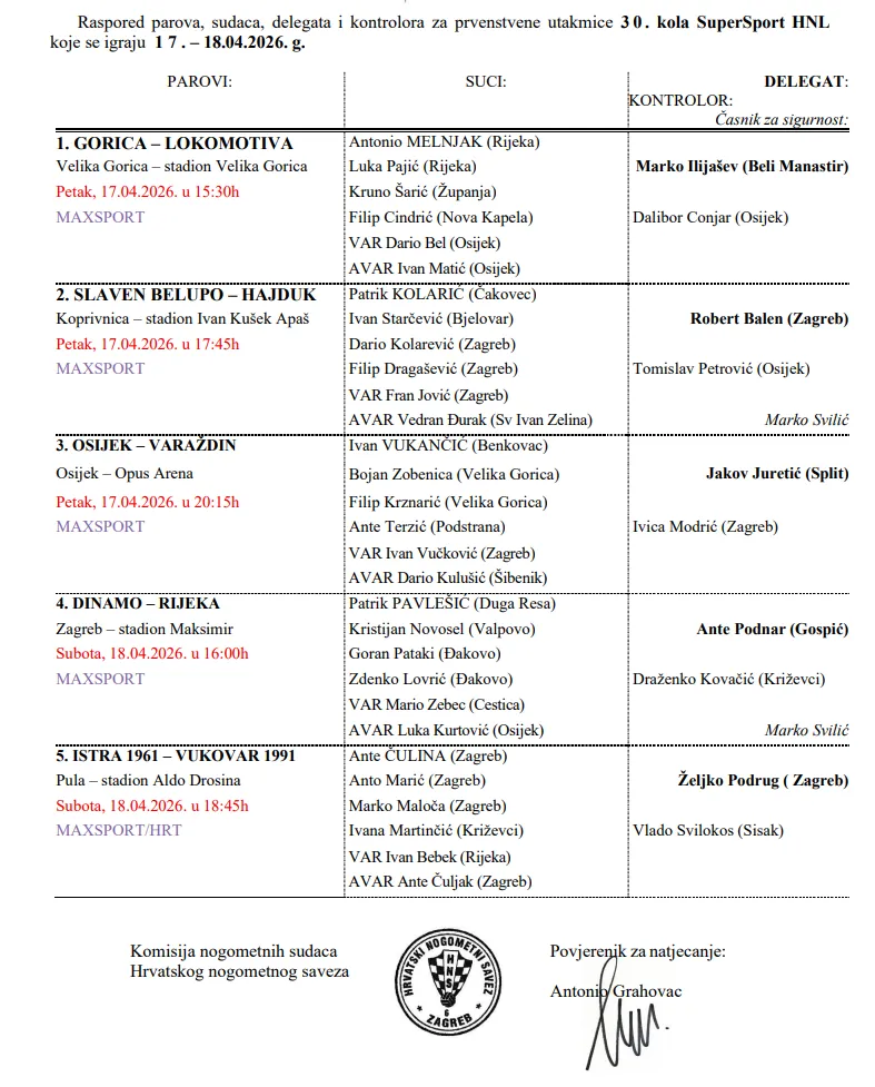 Derbi kola igra se, pak, u subotu u Maksimiru, gdje Dinamo dočekuje Rijeku od 16 sati. Patrik Pavlešić iz Duge Rese će biti glavni sudac na toj utakmici, dok su VAR-u Mario Zebec i Luka Kurtović.