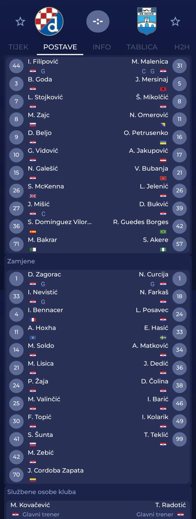Osijek (4-2-3-1): Malenica - Guedes, Jelenić, Mersinaj, Bukvić - Bubanja, Petrusenko - Akere, Mikolčić, Omerović - Jakupović. Trener: Tomislav Radotić.