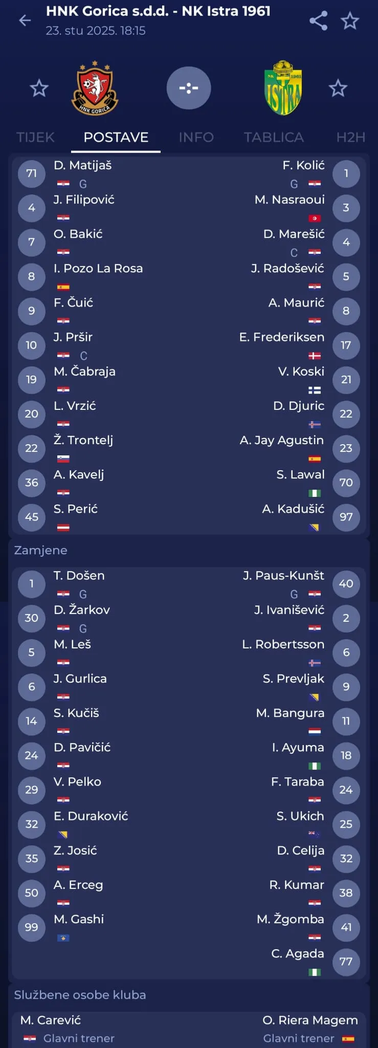 Istra 1961 (4-3-3): Kolić – Nasraoui, Koski, Marešić, Kadušić – Djuric, Radošević, Maurić – Jay, Lawal, Frederiksen. Trener: Oriol Riera.