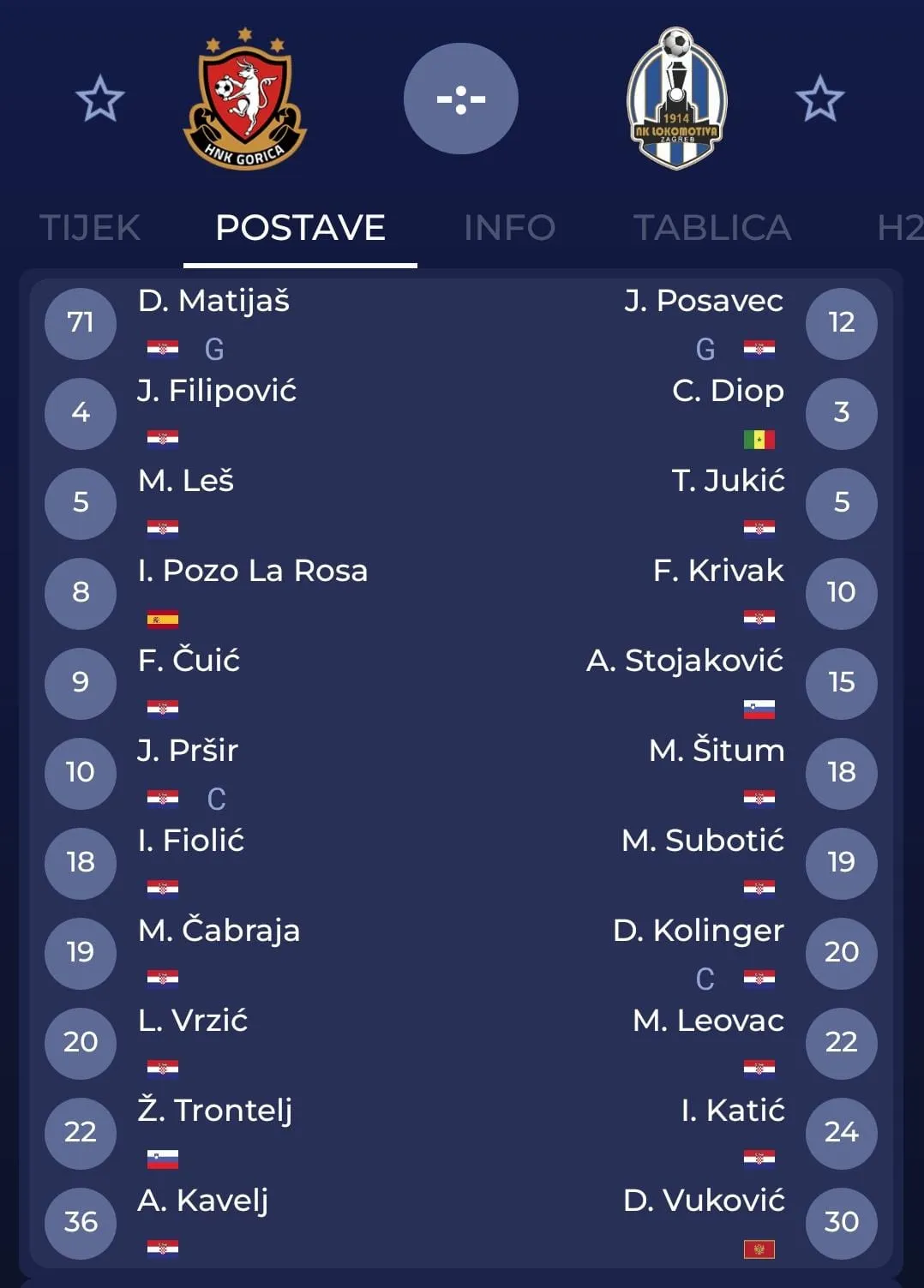 Gorica (3-4-2-1): Matijaš – Trontelj, Filipović, Leš, Čabraja– Pozo, Kavelj - Fiolić, Pršir, Vrzić - Čuić. Trener: Mario Carević.