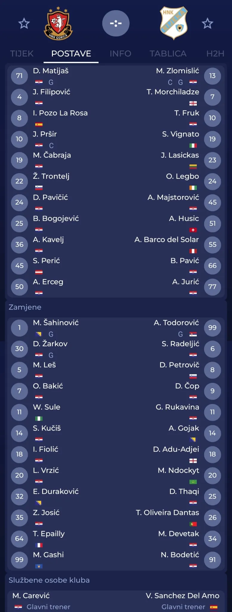 Rijeka (4-2-3-1): Zlomislić – Lasickas, Majstorović, Husić, Legbo – Pavić, Barco – Vignato, Fruk, Morčiladze – Jurić. Trener: Victor Sanchez.