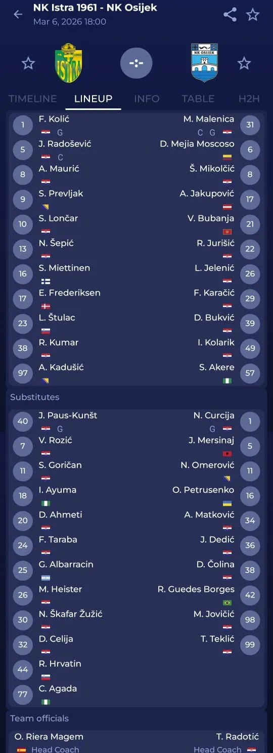 Osijek (4-2-3-1): Malenica - Karačić, Jelenić, Kolarik, Jurišić - Bubanja, Meija - Akere, Mikolčić, Bukvić - Jakupović.