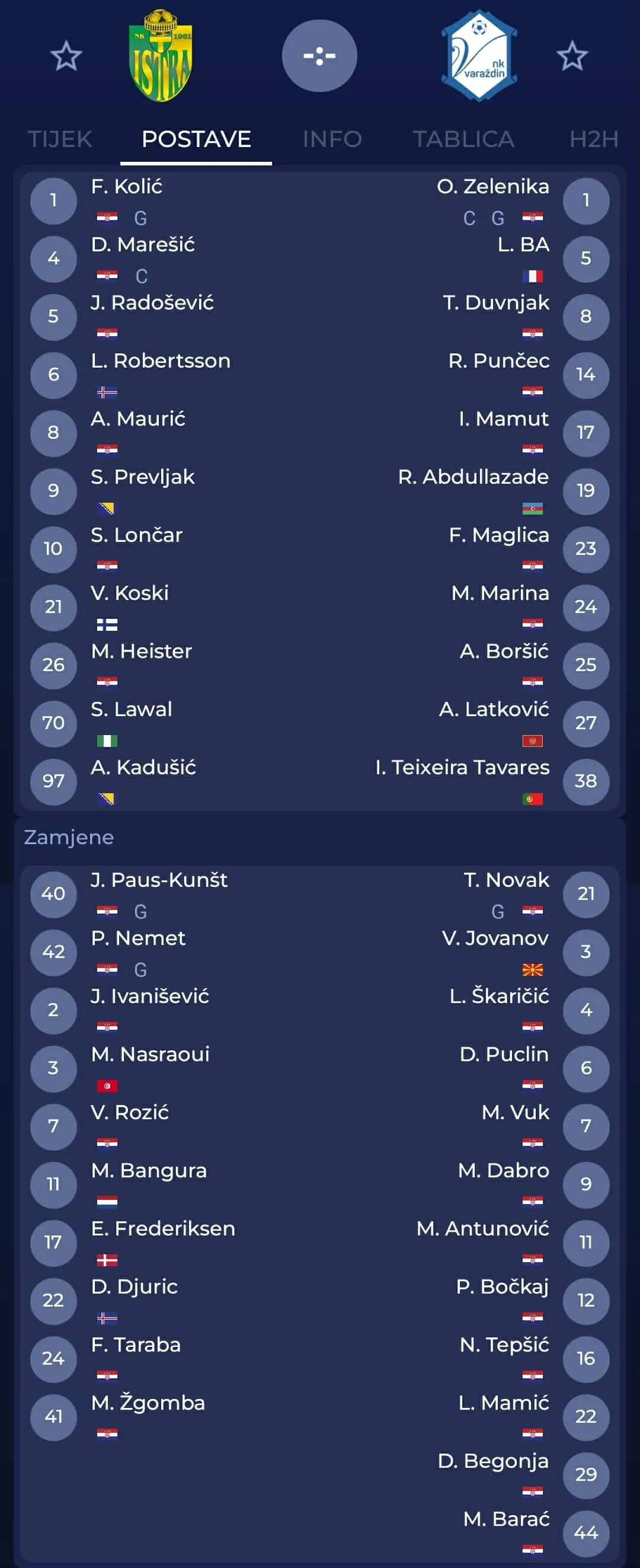 Istra 1961 (3-5-2): Kolić – Koski, Robertson, Marešić - Kadušić, Lončar, Radošević, Maurić, Heister – Prevljak, Lawal. Trener: Oriol Riera.