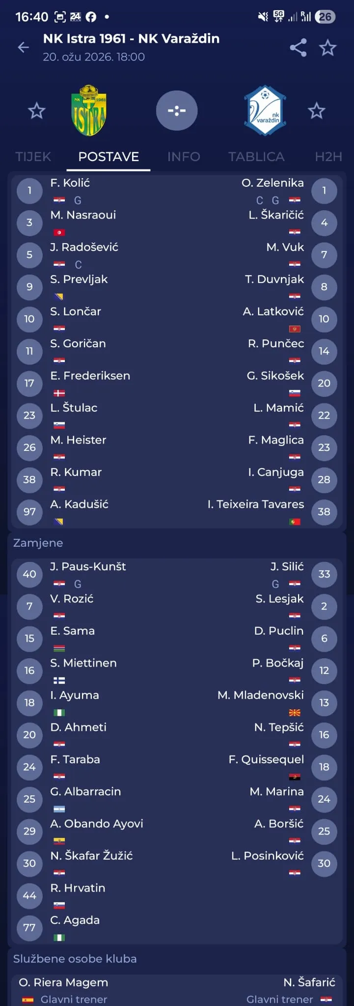 Istra 1961 (3-4-2-1): Kolić – Nasraoui, Kumar, Heister – Kadušić, Radošević, Štulac, Goričan – Frederiksen, Lončar – Prevljak. Trener: Oriol Riera.