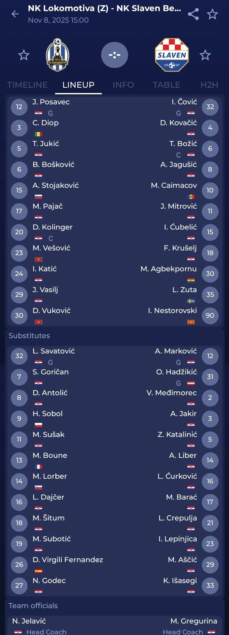 Lokomotiva (3-4-2-1): Posavec – Kolinger, Diop, Jukić – Vešović, Bošković, Katić, Pajač – Vuković, Vasilj– Stojaković. Trener: Nikica Jelavić.
