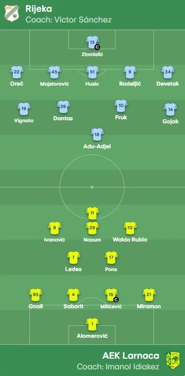 Rijeka (3-4-2-1): Zlomislić – Majstorović, Husić, Radeljić – Oreč, Gojak, Dantas, Devetak – Vignato, Fruk – Adu-Adjei. Trener: Victor Sanchez.